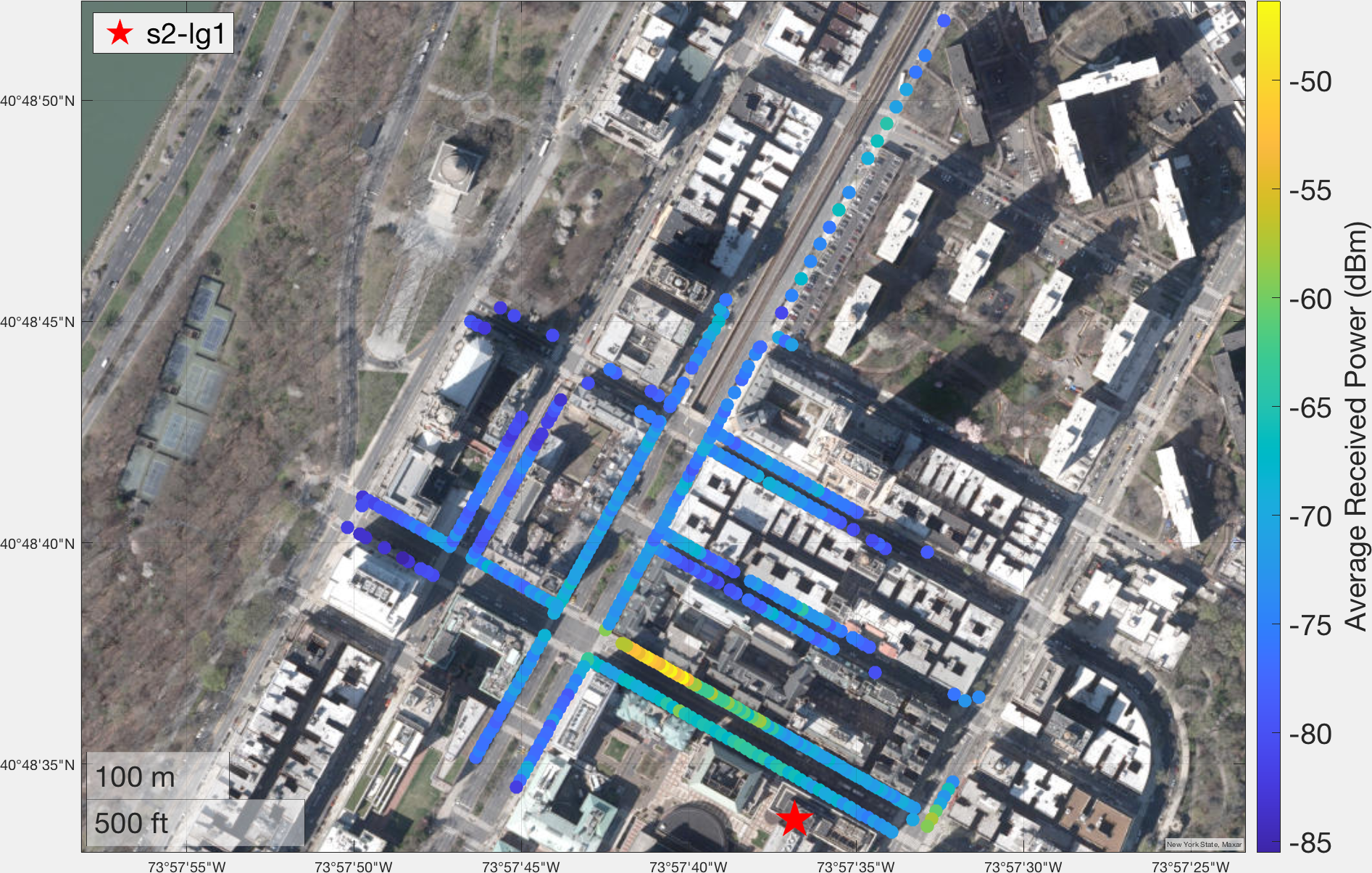 The measurements show -77 dBm RSSI at a link distance up to 550m distance away. The location with highest signal strength received was on 120th St within the 3dB beam width of the antenna. These measurements demonstrate that s2-lg1 provides coverage to a significant portion of Broadway almost up to 125th St, along with streets between Broadway and Amsterdam Ave. Coverage also extends to Riverside Park and portions of Claremont Ave.