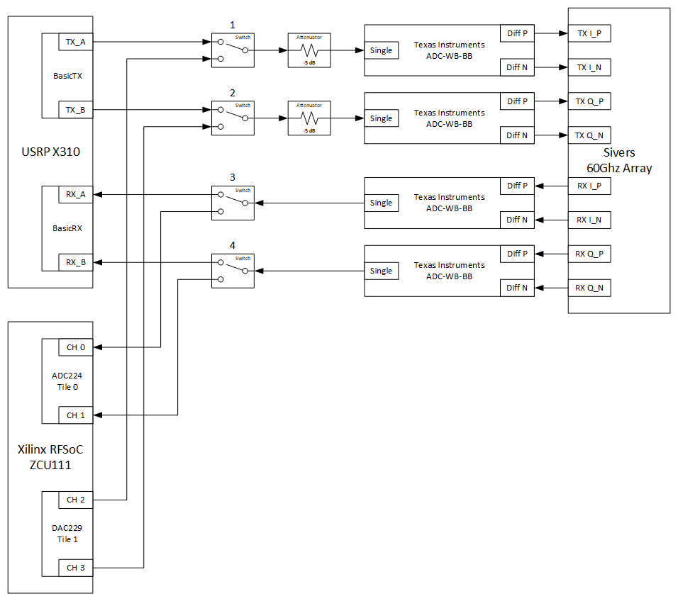 | Block diagram of RF connections between SDRs and Sivers array |