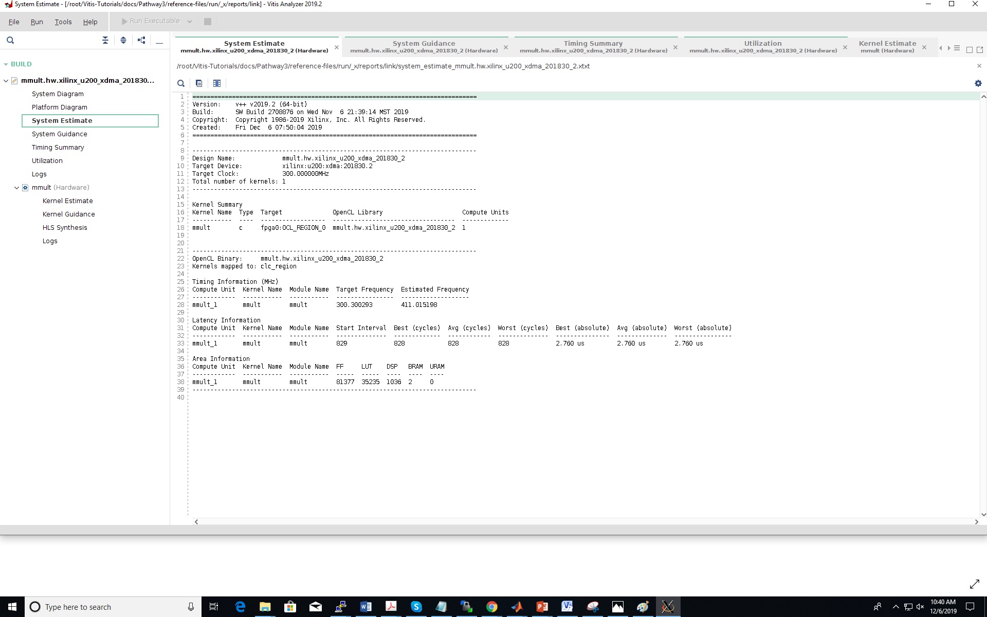 - System estimate report is generated while building the hardware target xclbin file. It gives information on the resource usage, clock frequency, kernel latency estimate, etc.