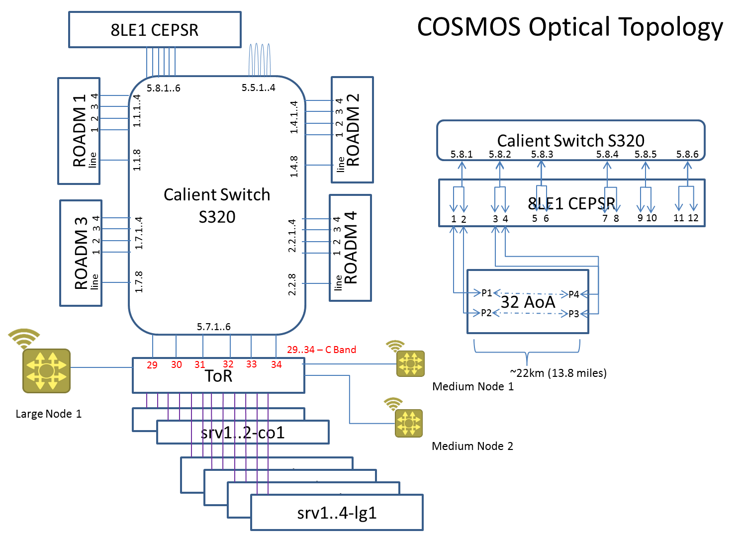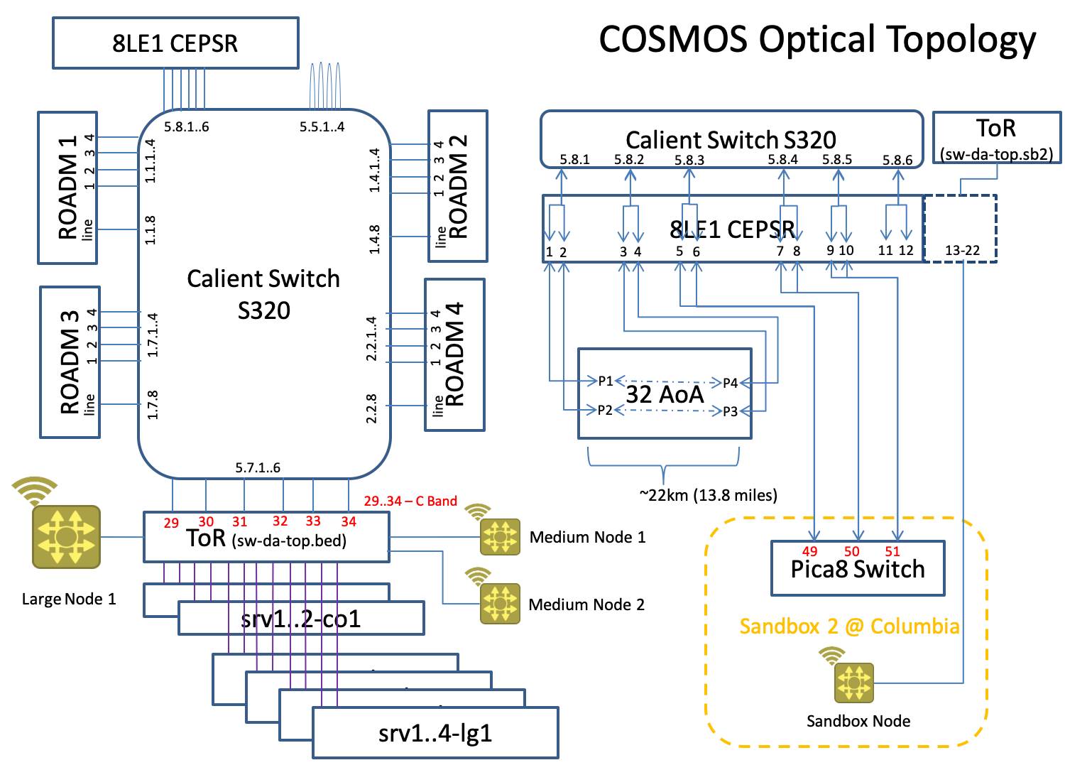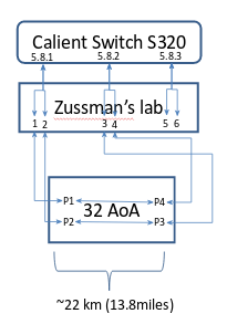 Calient Switch S320 has ports physically connected to ROADMs, ToR, Prof. Zussman’s lab and 3 loopback connections. All ports are designated in the Fig.2 Physical Optical Interconnections.