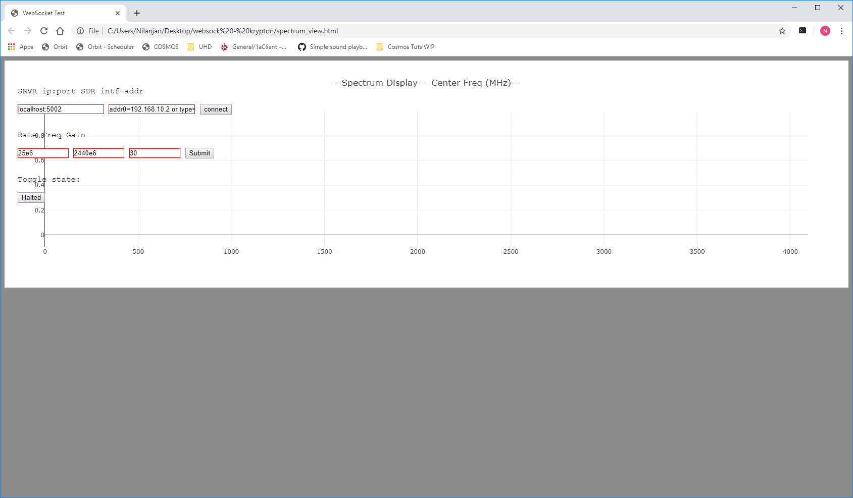 Click on the Halted button to begin streaming samples from the radio to the browser. This should display the spectrum if all went well.