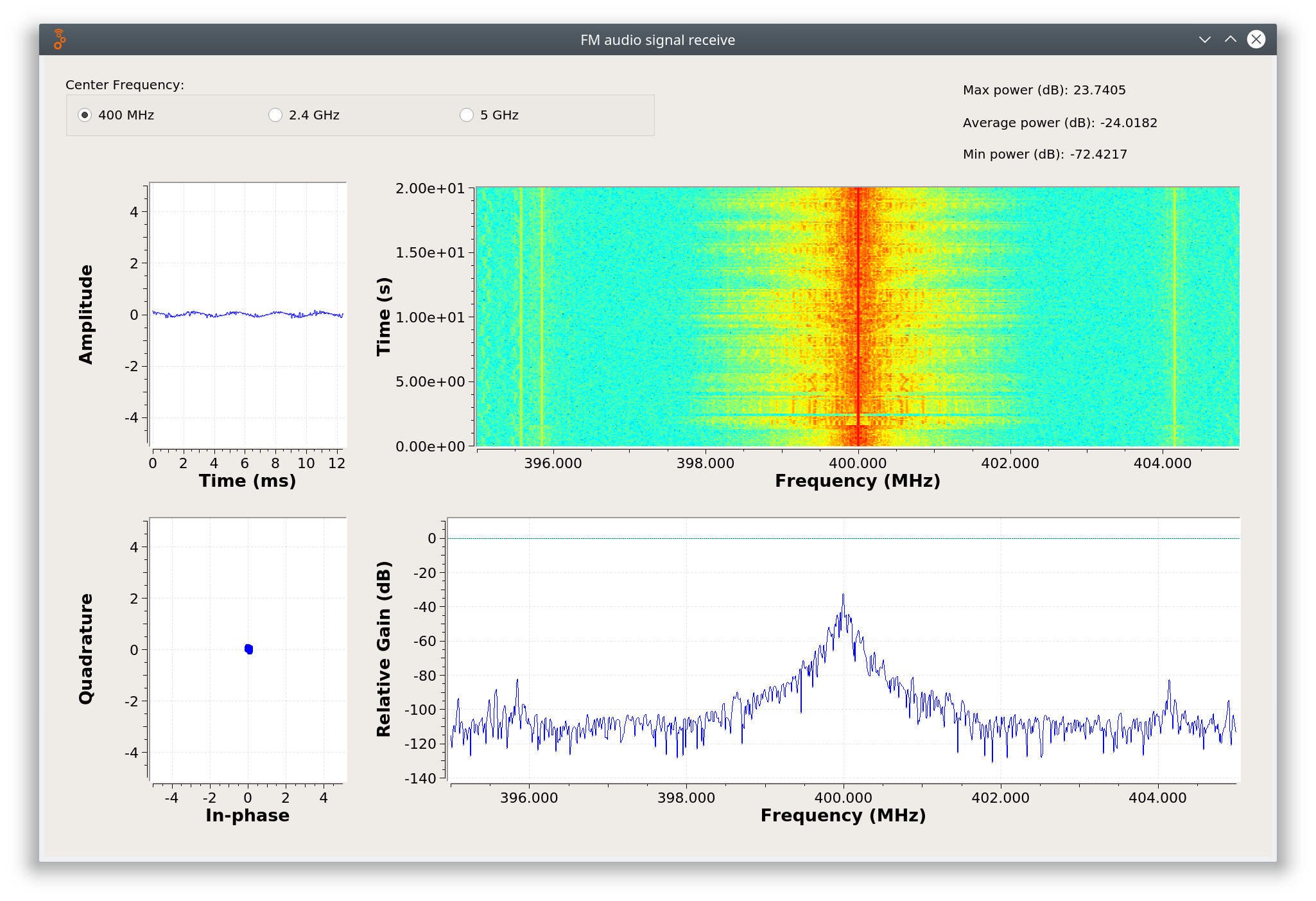 STARTeither under the receiver onnode #1ornode #2. In this tutorial we considersdr2-s1-lg1asnode #1andsdr2-md1asnode #2. The receiver will start listening to a specific center frequency (400 MHZ, 2.4 GHz, and 5 GHz), and will demodulate any incoming frequency modulated (FM) signal. The receiver will then create a TCP server at port8100to stream the audio to the local host.
