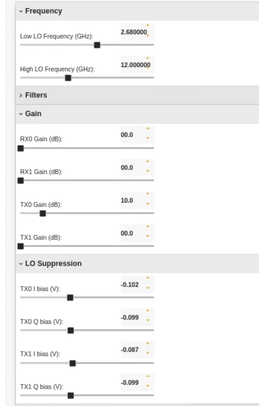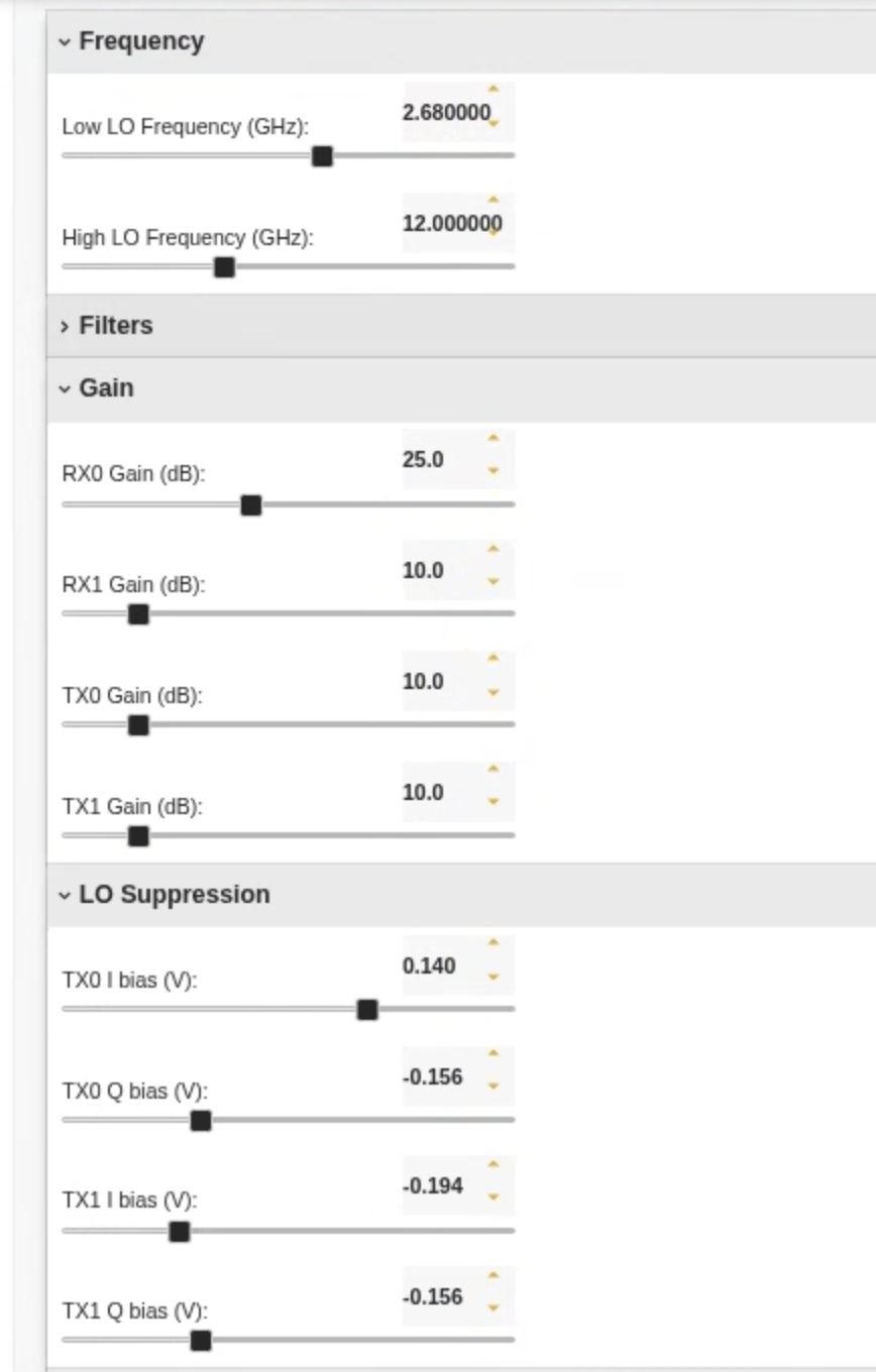 This example pairs a 2.68 GHz IF with a 12 GHz high-side LO (and a 2.68 GHz low-side LO) to place the RF tone at ~12 GHz, and back to 2.68 GHz on the receive path. (Exact placement depends on mixer sign/paths; the screenshot below shows the working settings used in this demo.) Leave Filters, Gain (except where noted), and LO Suppression at defaults for the first run.