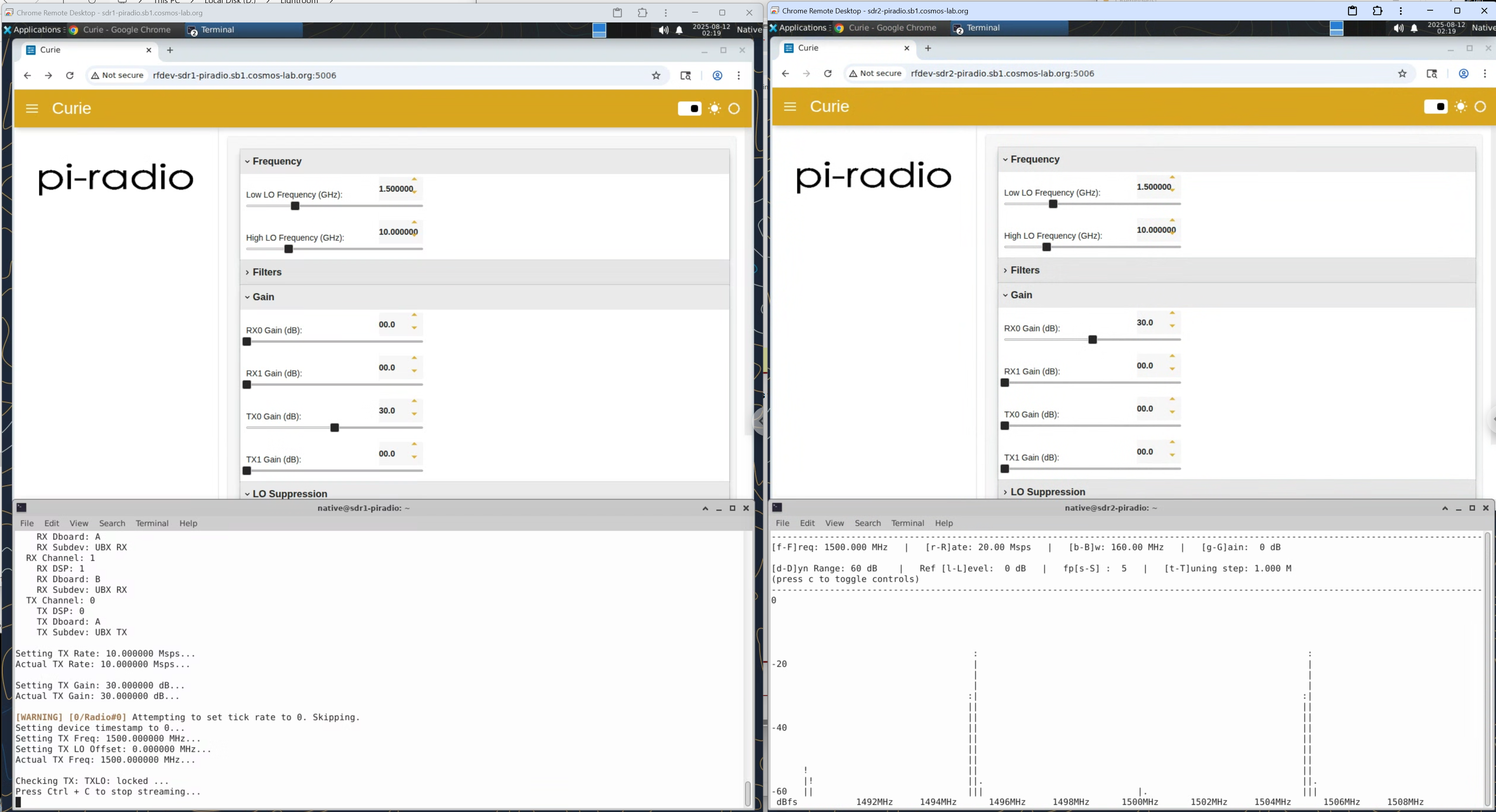 You should observe a stable, narrow spectral line(s) in the DFT display near the configured tone at 5MHz (with side-markers set by the viewer). The figure below shows both Pi-Radio UIs (left: Tx FE, right: Rx FE) with Low LO = 1.5 GHz and High LO = 10 GHz, the TX console (bottom-left) and the ASCII DFT (bottom-right) around 1.5 GH