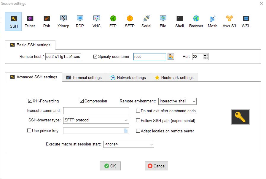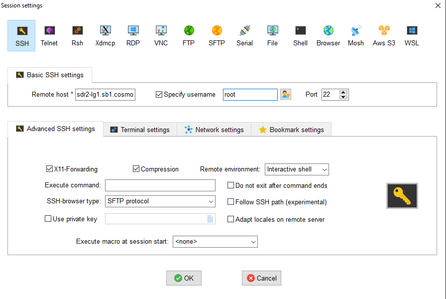 - Login into sandbox 1 console (console.sb1.cosmos-lab.org) with an SSH session. SSH session for COSMOS SB1 with Moba Xterm can be setup as shown, with remote host = console.sb1.cosmos-lab.org, and username = your COSMOS username.