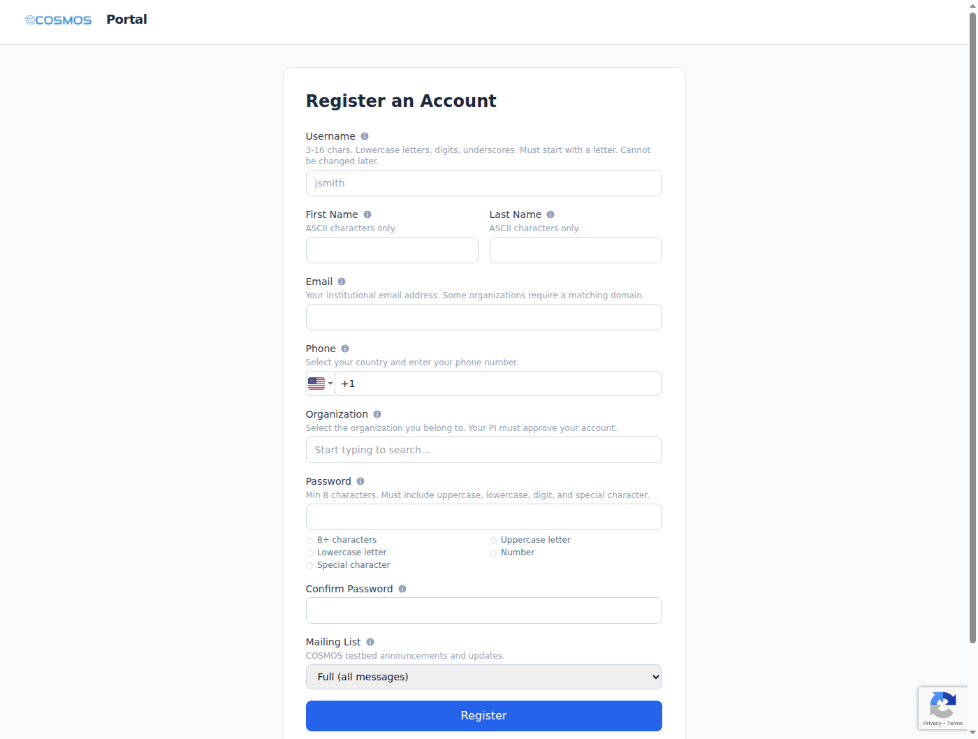 - Email — must be a valid institutional email. Some organizations enforce domain restrictions (e.g., only @university.edu addresses).