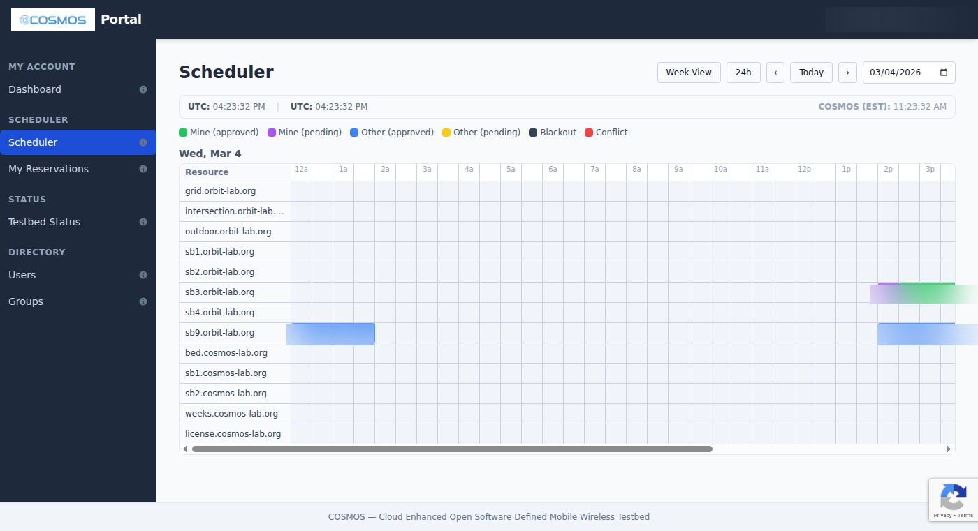 The COSMOS Portal is a web application for managing your testbed account, making reservations, and monitoring testbed resources. It is the primary interface for all COSMOS and ORBIT testbed users, from first-time registration through day-to-day experiment management. This guide covers the features available to regular users.