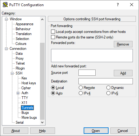 - If you click "Open", your session will start with the configured ports tunneled, but when you close the session you will have to configure the ports again. If you go back to the "Session" screen and save the settings, the port tunneling configuration will be saved for future use.
