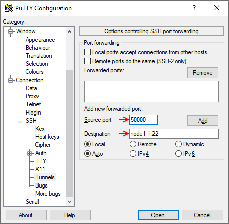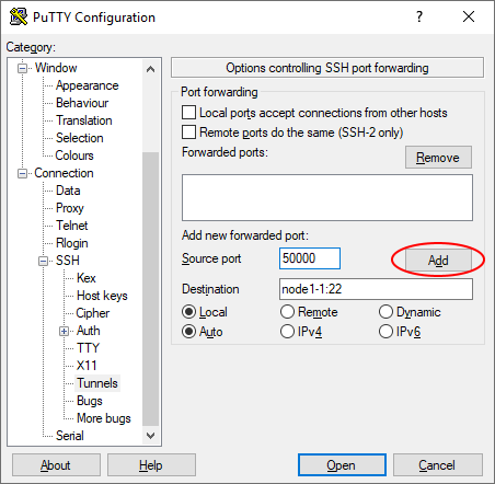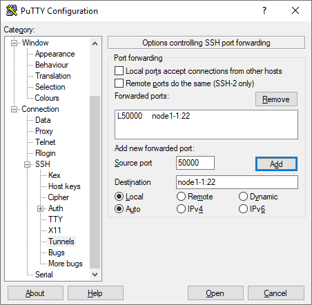- Enter the local port you want to forward in the "Source port" field and the remote resource name (or IP address) along with the remote port in the "Destination" field (Note the colon ':' between the two). Avoid using a local port that may conflict with locally running services. In this example, the local port 50000 is forwarded to port 22 on node1-1.