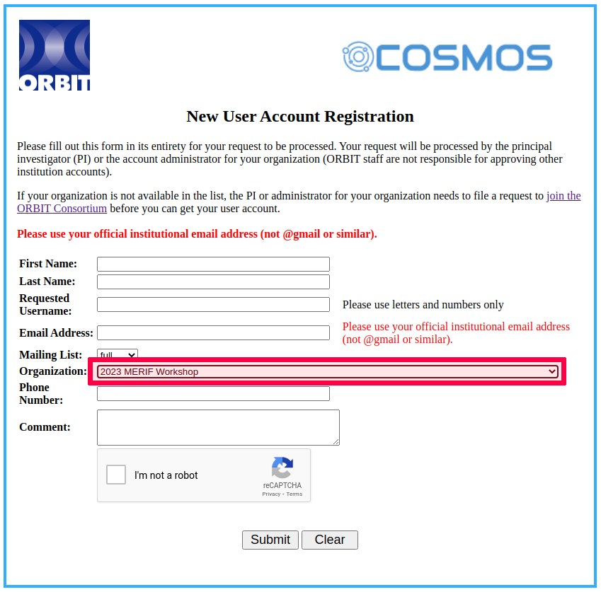 - Register for a Cosmos/Orbit account here: https://www.orbit-lab.org/userManagement/register. For your organization, please select "2023 MERIF Workshop" from the drop-down menu as shown: